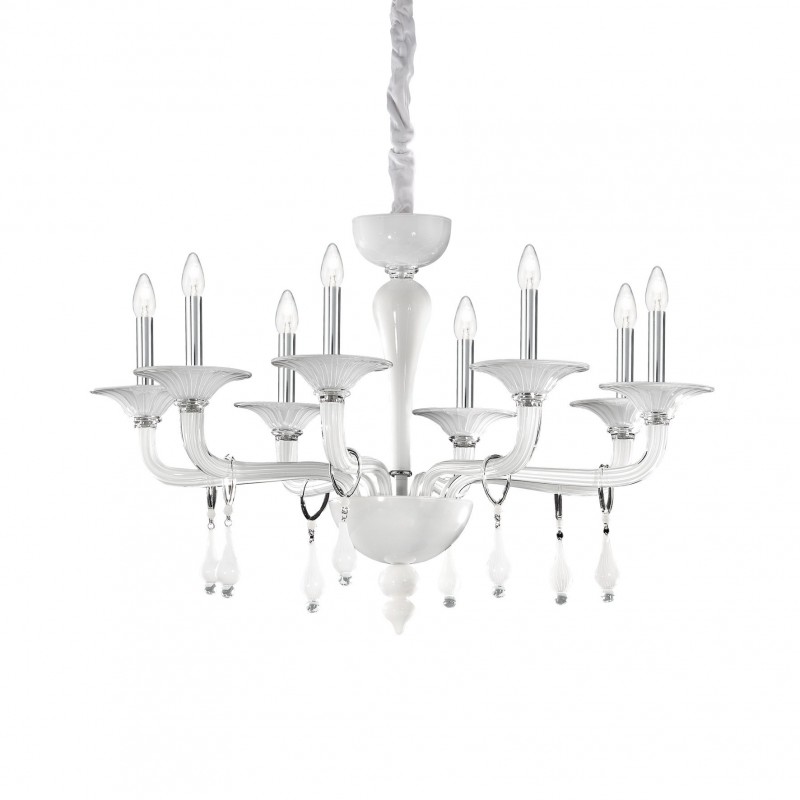 Lampadario in vetro trasparente e bianco soffiato e lavorato a mano.
