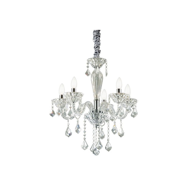 Lampadario in vetro soffiato lavorato a mano con dettagli in metallo cromato.
