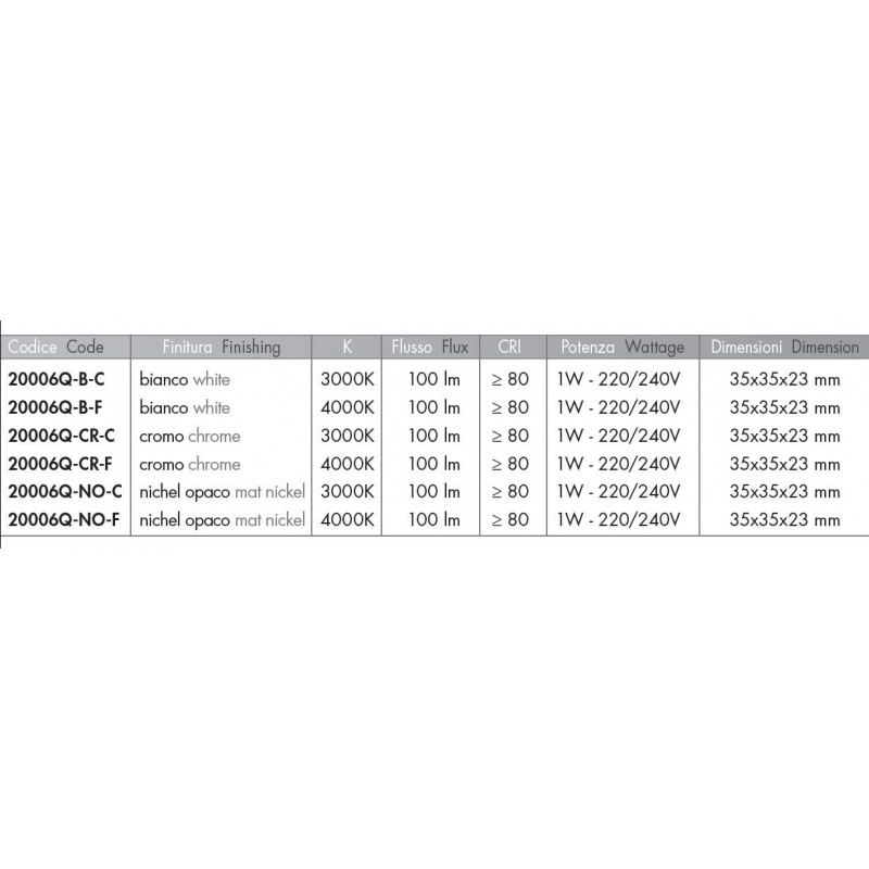 Disponibile nelle versioni 3000K e 4000K e in tre finiture: bianco, cromo e nichel opaco.