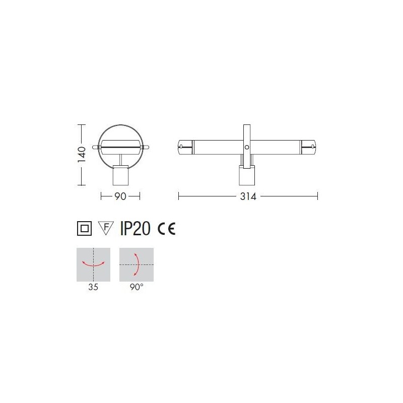 La sorgente è regolabile e orientabile di ±90°sull'asse orizzontale e di ±35°sull'asse verticale.