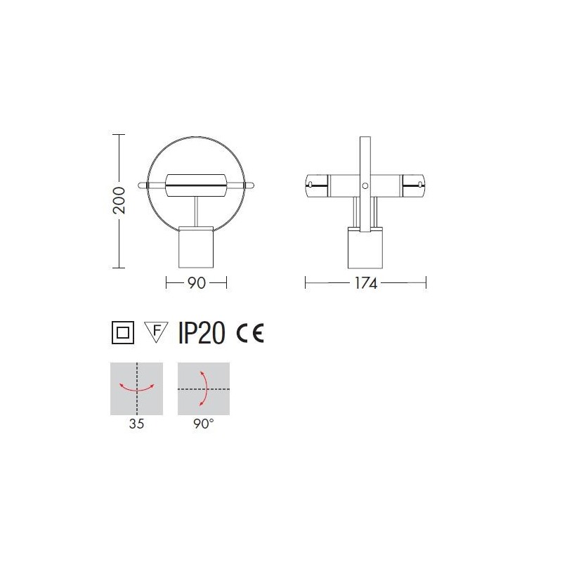 La sorgente è regolabile e orientabile di ±90°sull'asse orizzontale e di ±35°sull'asse verticale.